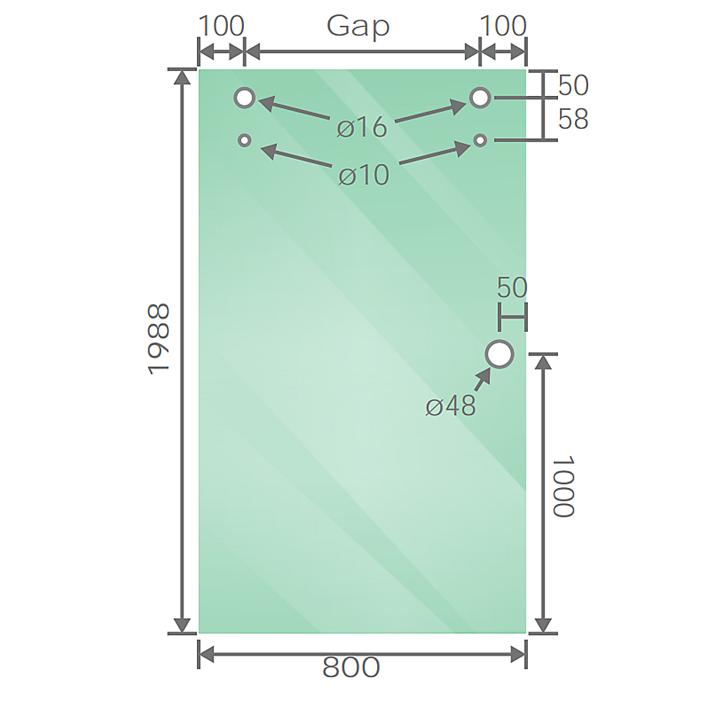 Tailored for a frameless shower screen featuring a sliding door, glass screen for the side panel showcases 10mm clear toughened glass with 2mm radius corners and polished edges. All measurements are in millimeters, and the panels come pre-drilled to seamlessly fit various styles of shower hardware.