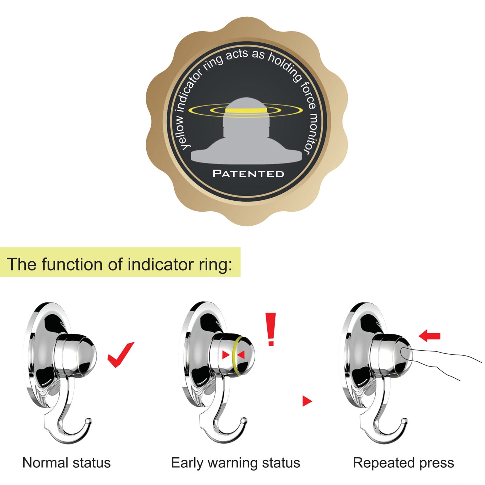 Indicator Ring acts as a holding force monitor to help you to check if the suction hook is safe or not. It is very easy to reinforce the suction cup, press the button again only.