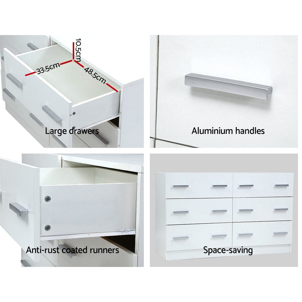 Practical and handsome, our Artiss 6-drawer Lowboy is perfect for those looking for extra storage space for your home. Contemporary and simply designed, this beauty features a flawless melamine finish with elegant handles that will easily match your home d��cor. Made with premium 15mm thick particle board with anti-rust coated drawer runners, our lowboy works ever so smoothly with minimum hassle. Not least, it provides plenty of storage space with six generous-sized drawers for all your clothing, fashion essentials and more.