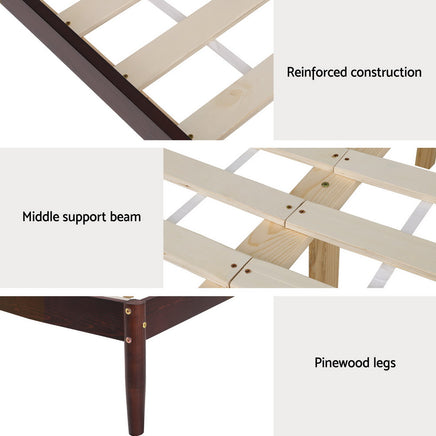 A simple yet elegant addition to any modern bedroom, the Vise Bed Frame from Artiss is a versatile and budget-friendly piece that doesn't compromise on quality. Its modern Scandinavian design is sure to light up your bedroom and impress your family and guests alike. Crafted using a solid pinewood frame with a walnut finish, this bed frame exudes elegance and sophistication. The slatted bedhead adds a touch of contemporary charm and allows for adequate ventilation throughout the night. Sturdy reinforced wooden slats, high-quality metal fixings and a middle support beam provide a solid foundation for your mattress. The smooth and safe edges not only enhance the aesthetics but also prioritize your safety. Supported by strong and stable legs, this bed frame guarantees stability and peace of mind while you sleep. The frame is designed to fit standard Australian mattress sizes, making it a versatile piece for the modern home. Easy to assemble and even easier to maintain, your sleep is secured with the Vise Bed Frame from Artiss.