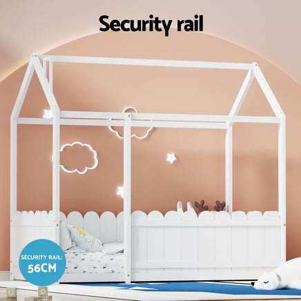 Introducing our whimsical house-shaped bed frame, crafted from solid pine wood for ultimate durability. Designed with kids in mind, it features safe, non-toxic paint, smooth edges, and sturdy construction. Easy to maintain and fitting a standard Australian Single mattress, it's the perfect addition to any child's bedroom.