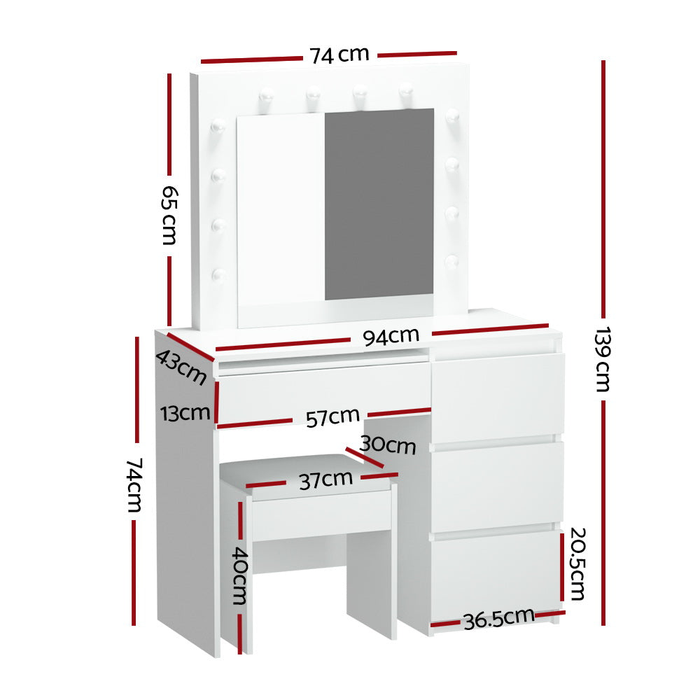 Add a touch of Hollywood glamour with the Artiss LED dressing table. It will help you achieve a flawless and well-groomed look that you'll love. With its illuminated mirror, getting ready can become less chaotic and help you put your best self forward. The LED dressing table comes with 12 LED bulbs for better illumination and clarity. It has three colour options - neutral white, warm white, and daylight white, allowing you to choose the best lighting for detailed makeup. You can even adjust the brightness to get the right look and flawless finish. This dressing table features four spacious drawers. No matter how many makeup products you have, they're sure to fit in the available space. You can group and organise your makeup essentials in each drawer, so you never struggle to find them. Our dressing table also has a soft padded stool upholstered in PU leather. It’s well-constructed for your comfort and long-lasting use. Furthermore, our LED dressing table is made using an eco-friendly particle board frame with a melamine finish. It's quite sturdy and has smooth finish edges, which makes it safe to use. Not least, the dressing table is easy to clean. Just a simple wipe with a dry cloth is enough.