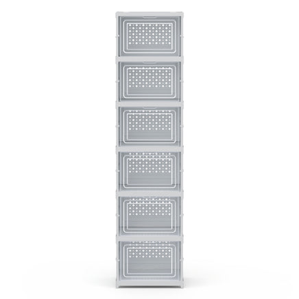 Maximise your space with this versatile Artiss shoe rack! Crafted from durable PP plastic, this 6-tier organiser offers clever shoe storage for entryways, cloakrooms, or garages. The innovative foldable design features a one-piece frame for quick setup, breathable back flaps, and see-through doors with raised handles for easy access. Each compartment holds up to 2.5KG, providing practical shoe box storage without sacrificing style. Perfect for small homes! Dimensions: 25.5x34.5x105cm. White. Assembly required (1 package).