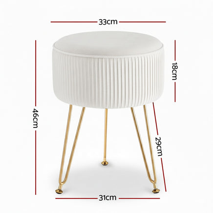 Round velvet Artiss footstool with vertical stripe design, durable MDF frame, and high-resilience foam padding. Features protective metal legs and simple assembly.