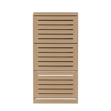 Artiss Shoe cabinet blends rack storage with cabinet convenience, featuring 3 flip-up drawers and 3 adjustable shelves behind slatted ventilation doors. This space-smart entry organiser holds 21-45 pairs (men's/ladies'/kids' sizes) across tiered racks. Built from tough particleboard with 40kg top strength and push-open ease. Comes with wall attachment for safe install - brilliant for hallway shoe storage with 30kg drawer limits.