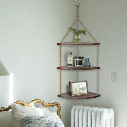 Made from solid wood boards with twisted jute rope, this hanging shelf blends rustic charm with modern style. The warm brown finish adds a natural, decorative touch to any space.