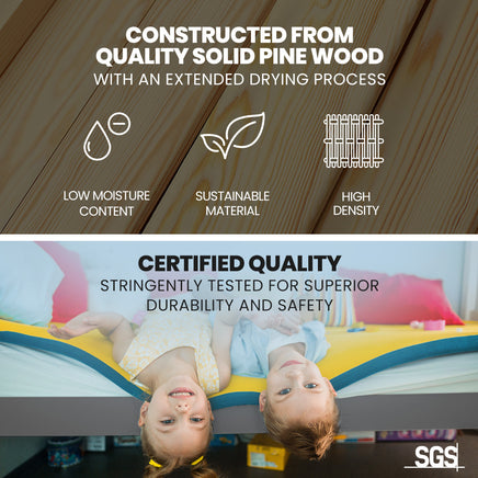 The Kingston Slumber Triple Bunk Bed Frame is crafted from solid high-quality sustainably sourced timber and is compatible with standard Australian single and double sized mattresses. Safety is paramount with SGS-certified quality, rigorously tested for superior durability. The bed features durable plywood slats and a solid, secure ladder. It even features an exclusive toy shelf which is sure to be a nice home for their favourites.