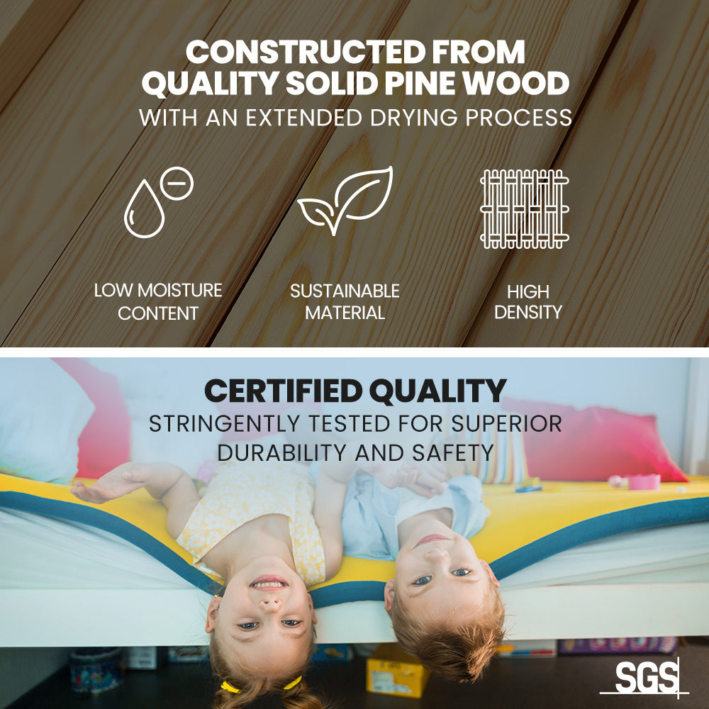 The Kingston Slumber Triple Bed Frame is crafted from solid high-quality sustainably sourced timber and is compatible with standard Australian single and double sized mattresses. Safety is paramount with SGS-certified quality, rigorously tested for superior durability. The bed features durable plywood slats and a solid, secure ladder. It even features an exclusive toy shelf which is sure to be a nice home for their favourites.