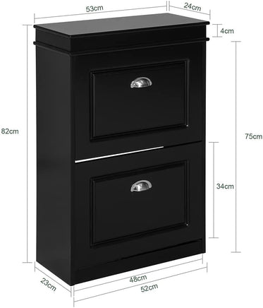 - This stylish shoe cabinet brings a sleek and modern look to any room. With its matte black finish, it's sure to turn heads. It also offers two tilt-out drawers, giving you plenty of space to store up to 12 pairs of shoes. Keep your footwear organized and out of sight with this chic and practical piece.