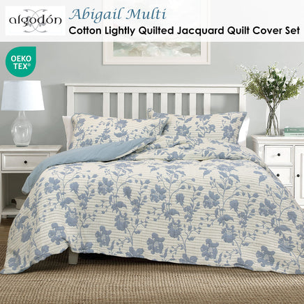 The Algodon Abigail Multi Lightly Quilted Cotton Jacquard Quilt Cover Set, where nature's beauty blooms in every thread. Featuring an intricate floral design in cream and blue hues, along with subtle stitch detail. This set makes a statement with its detailed florals and contrast pipped edges.