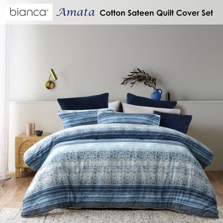 Brighten your space this winter with Amata Blue Cotton Sateen Quilt Cover Set by Bianca. The use of white, blue, grey, and teal tones create a sense of calm. The silky feel of soft cotton sateen fabric is perfect for cuddling up to in bed. Flawless piped edging in white allows for a beautiful contrast.