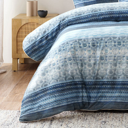 Brighten your space this winter with Amata Blue Cotton Sateen Quilt Cover Set by Bianca. The use of white, blue, grey, and teal tones create a sense of calm. The silky feel of soft cotton sateen fabric is perfect for cuddling up to in bed. Flawless piped edging in white allows for a beautiful contrast.