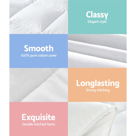 Indulge in luxury comfort with our finely constructed Giselle Bedding Goose Down Feather Quilt. It is the perfect quilt to provide you with seasonal comfort and a great feeling at all times. Filled with goose down feathers with 800gsm weight, the quilt embodies a baffle construction that prevents shifting of the filling and helps to expand the down to retain heat, providing optimal warmth. The goose down feathers are lightweight and provide true warmth without added weight. Plus, the quilt is mite and mould-resistant and easy to maintain. Not least, the cover itself is 100% pure cotton with a 233 thread count for exceptional quality.