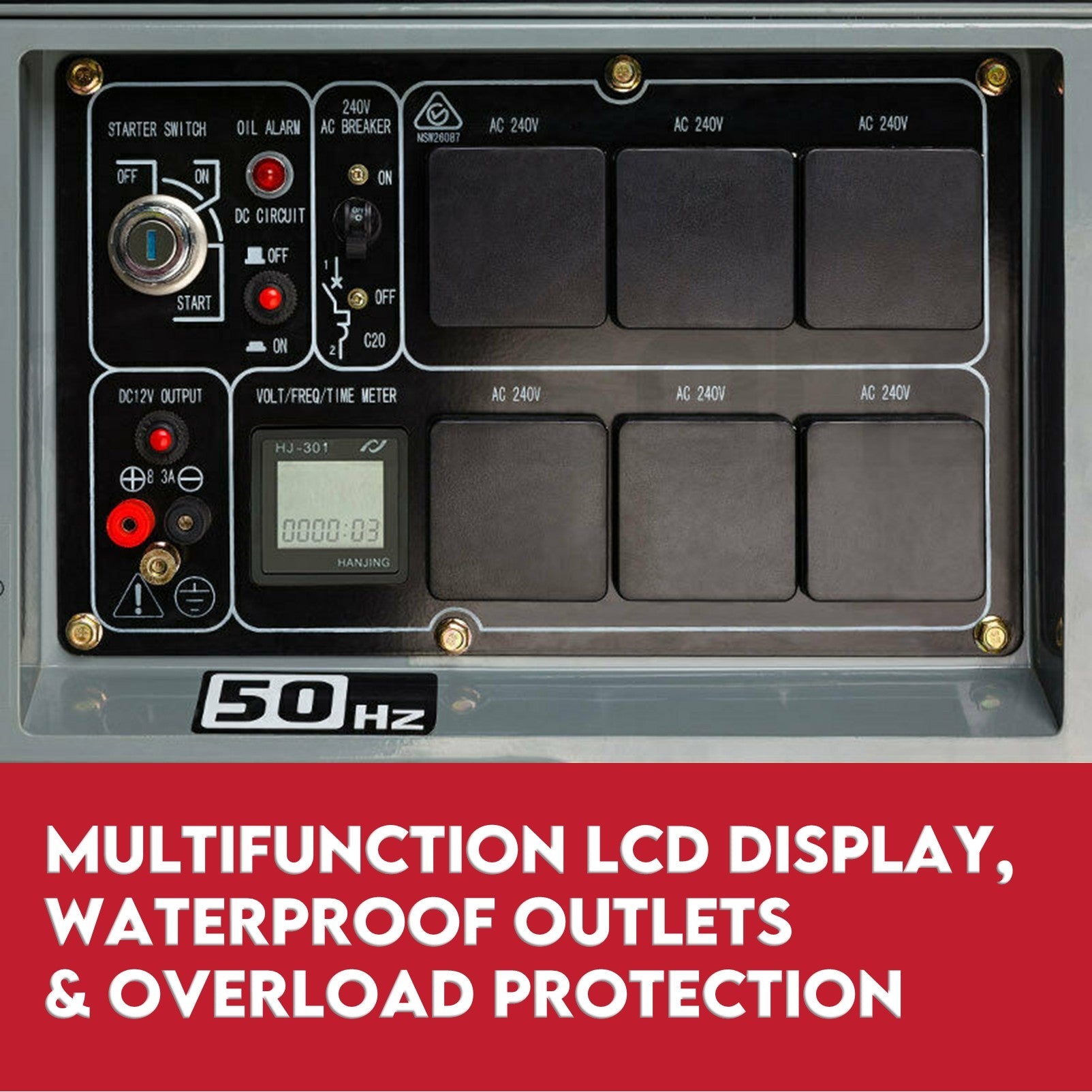 It features 6x 240V AC outlets, a 12V DC battery-charging outlet, and an 8.3amp 12 volt DC outlet. It could comfortably run a range of tools, white goods and lighting.