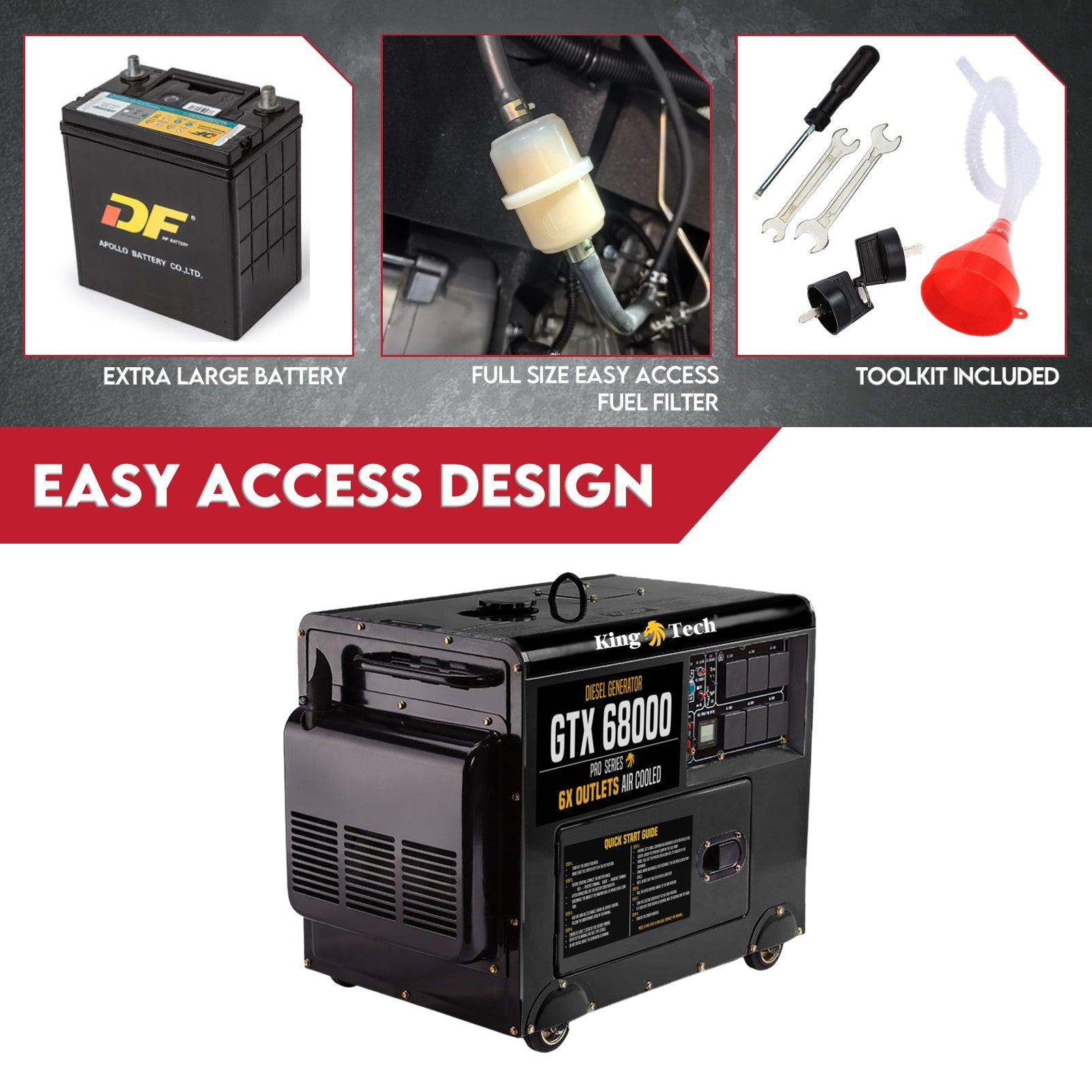 The King Tech GTX 68000 Diesel Generator is the perfect combination of versatility. It gives convenience whether you need power for your home, RV or project. It is ideal for standby or prime power use, where the electricity is unavailable.
