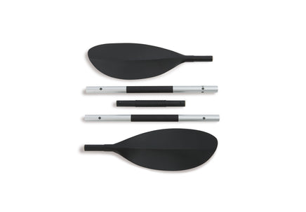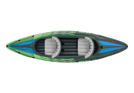 The Intex Challenger K2 Kayak is sporty and fun with a streamlined design for easy paddling. The bright green color and sporty graphics make the kayak highly visible in the water. Great for experiencing lakes and mild rivers solo, this Sports Series kayak is perfect for two adults. Lightweight and compact, this kayak is very easy to assemble and, with the Boston valve, it inflates and deflates in minutes. You can take the fun of kayaking wherever you go.Made with rugged vinyl construction and built for performance, this sturdy kayak has an inflatable I-beam floor, a low-profile deck and high-buoyancy side chambers for stability, comfort and function. A removable skeg provides exceptional directional movement, while an adjustable, inflatable seat with a backrest is included for comfortable seating. A grab line at each end is provided for your convenience, as well as a cargo net for extra storage, a NMMA certified U.S. Coast Guard I.D., and a repair patch kit. The Challenger K2 Kayak provides added accessories including: two 86 inch aluminum paddles and an Intex high-output pump for easy inflation and deflation.Details: Sporty graphics for high visibility
