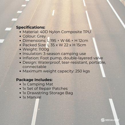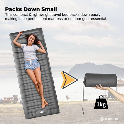 Social Hike Step-Inflating Camping Mattress makes sleeping comfortably outdoors easy! This inflatable sleeping pad is made from durable 40D nylon TPU, creating a lightweight, waterproof air mattress that inflates quickly by stepping.