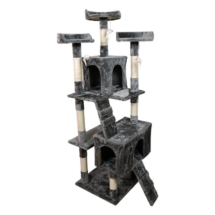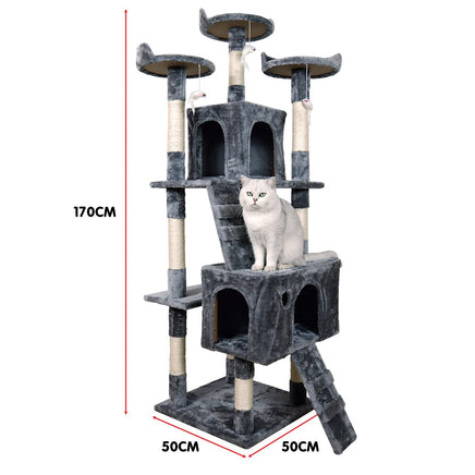 At 170cm tall, it features two cubby houses, two ramps and multiple shelves to perch, climb and nap on. The dangling toys right at the top provide a healthy outlet for your cats hunting instincts. And the built-in scratching posts will let your cats sharpen their claws without damaging your rugs or furniture.