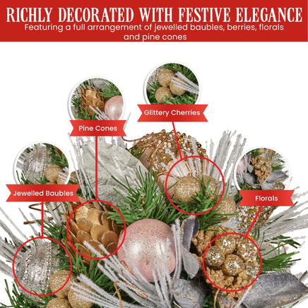 - Decorations: Jewelled Baubles, Berries, Flowers and Pine Cones