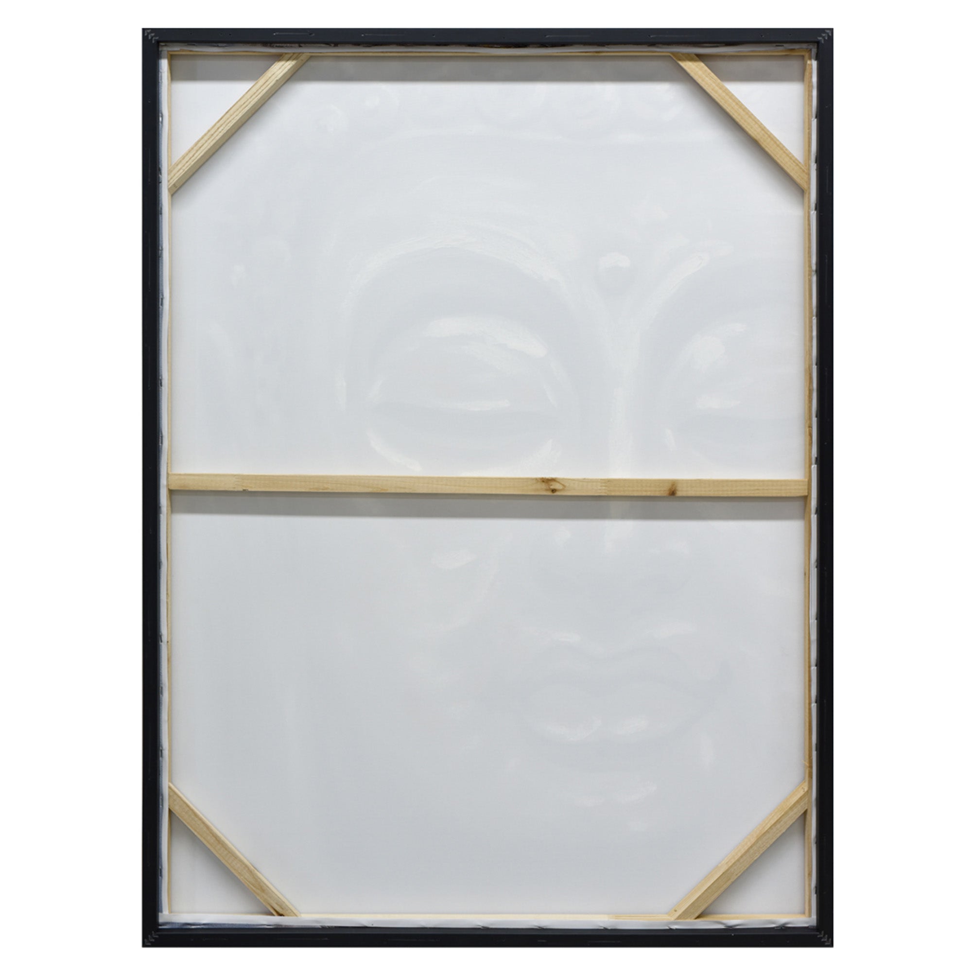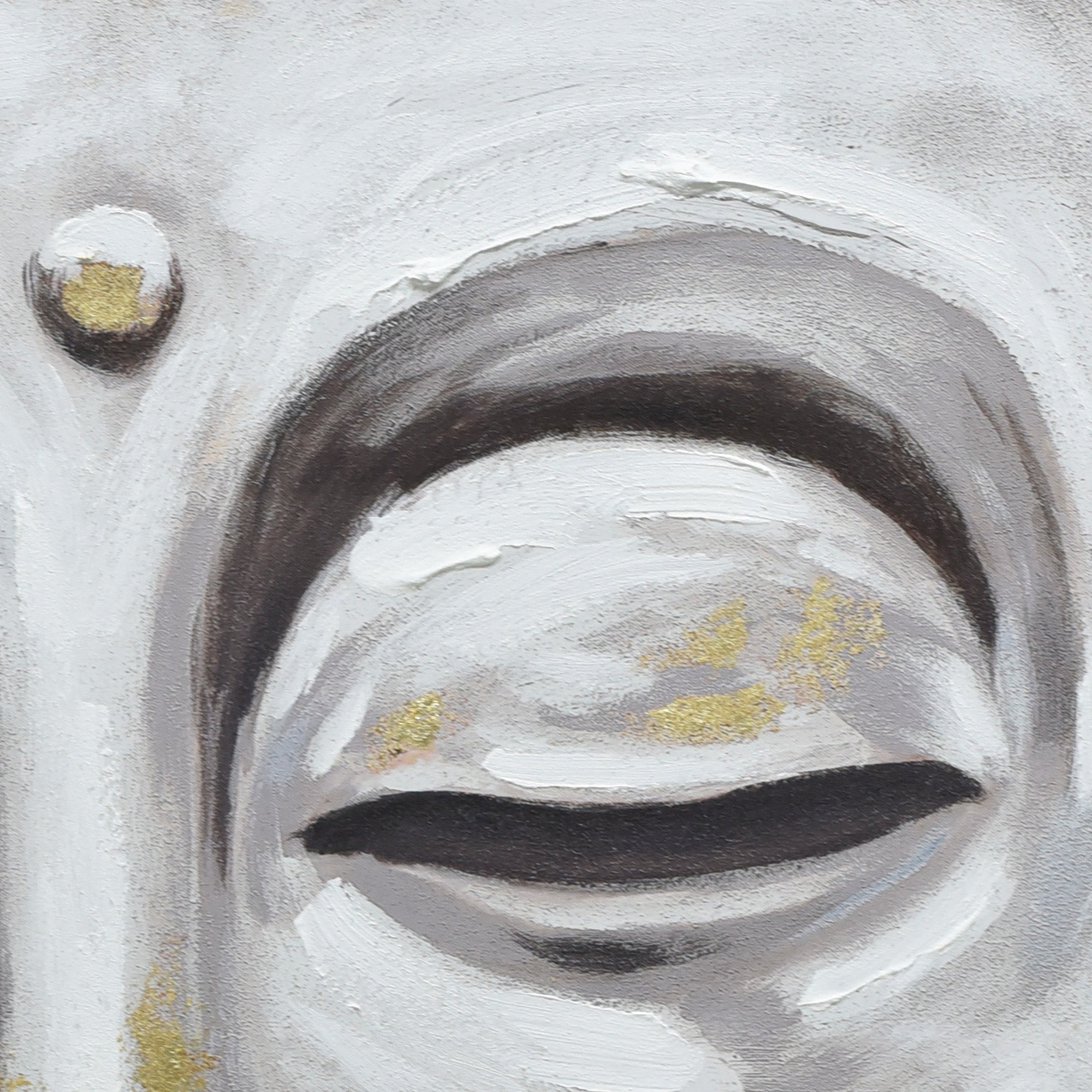 "Serene Radiance" is an evocative portrayal of spiritual tranquility, capturing the essence of Buddha in a close-up, almost intimate rendering. Bathed in soft hues of light grey and white, the visage exudes an aura of peace and introspection, amplified by the closed eyes that hint at deep meditation. The gold highlights delicately accentuate the facial contours, adding a touch of opulence to the subdued palette. This ethereal face occupies the majority of the canvas, with the three-quarter positioning allowing for a glimpse of the serene light blue backdrop on the right. The choice of a champagne frame complements the artwork, elevating its elegance. Crafted with a blend of hand-painted and printed techniques, "Serene Radiance" serves as a poignant reminder of the inner peace that lies within, beckoning viewers to pause, reflect, and find solace.