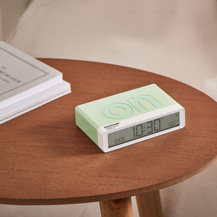 Lexon Flip Classic Reversible Alarm Clock PANTONE - Green - Fun and equipped with two faces (ON / OFF), the alarm clock must be turned down to be activated or deactivated with a simple gesture. Thanks to its integrated touch control, you just have to touch it to trigger the light of its LCD display. In addition, Flip Classic features some discreet buttons on its back to set the time/date format, alarm and screen brightness. Designed to be your ultimate bedside companion, Flip Classic boasts a 6-month battery life, rechargeable via USB-C. A battery indicator is visible on screen so you’ll easily know when to recharge your device.