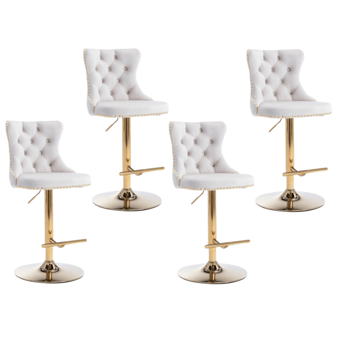 This bar stool features a sturdy golden chromed metal base with a built in 360 swivel function and footrest. A plastic ring is attached to prevent floor from scratching.