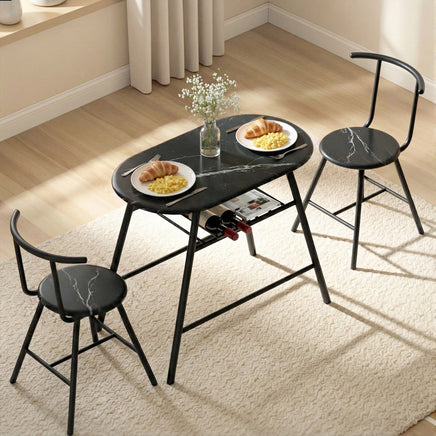 Transform even the smallest corner into a stylish dining nook with the Artiss 3-Piece Marble Look Dining Set. This compact bistro set is defined by its elegant oval tabletop with a striking black marble finish and a sleek industrial metal frame. More than just a table, it features a clever under-table rack, perfect for storing your favourite wine bottles or reading materials. Whether for a studio apartment, a balcony, or a cosy breakfast spot, this set delivers functionality, durability, and modern flair in one compact package.