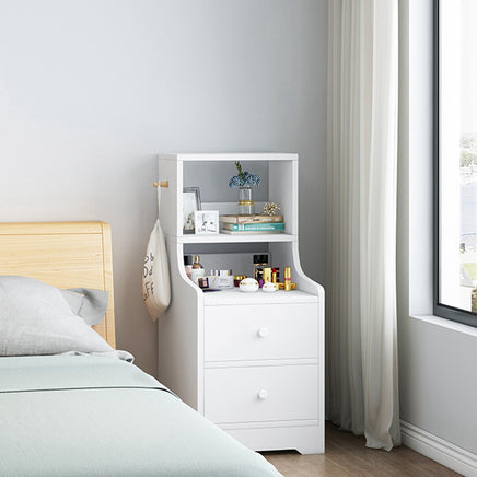 This modern minimalist bedside table features a pure warm white design, displaying a fresh and elegant visual effect. The innovative stepped design includes two open storage shelves, with the top level perfect for placing decorative items and photo frames, while the middle level is ideal for displaying cosmetics and skincare products. The bottom section features two spacious drawers with matching round knobs, providing ample private storage space. The elegant curved side design adds a soft touch, and the overall shape is fashionable and modern, suitable for various bedroom styles, especially as a dressing table or bedside storage cabinet. The tall design provides more storage space, making it both practical and decorative.