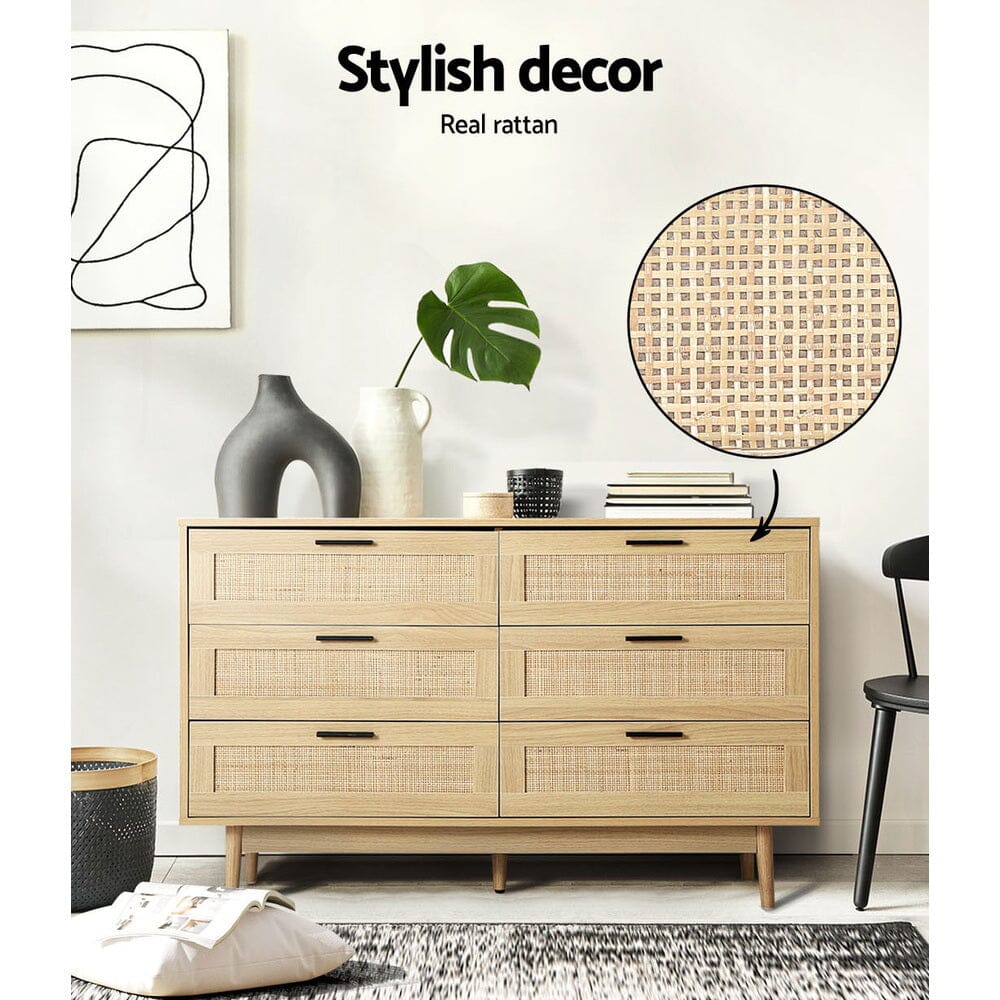 Featuring a beautiful and creative design, this real rattan furniture makes an ultimate upgrade and a perfect addition to your bedroom decor. It will give your space an instant lift without any extra effort with its elegant and stylish appearance. It has six spacious drawers to store your belongings in an organised manner. You can devote a drawer to each group of items and never struggle to find them. It makes life so easy and mess-free. So cut the clutter and tidy up your space with our rattan six-drawer lowboy. You can even mix and match and style this lowboy with our other rattan series furniture. Our real rattan lowboy features sleek handles, great surface smoothness, quality floor protectors to protect your floors from scratching or any other damage, and smooth anti-rust runners for hassle-free operation. Plus, you will not have to spend a lot of time cleaning and maintaining. Furthermore, it is resistant to decay and rot, offers high stability with extra support leg and can even be painted to suit your home decor. Not least, it is environmentally friendly and easy to assemble.