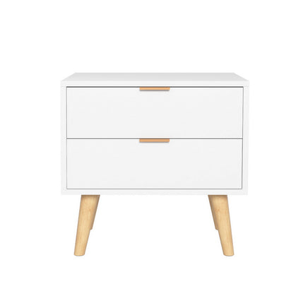Crafted from durable particle board, this Artiss bedside table boasts ample storage with two spacious drawers, adorned with sleek aluminium handles. Supported by sturdy pine wood legs, it's easy to assemble and maintain, complete with floor protectors.