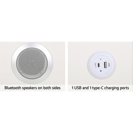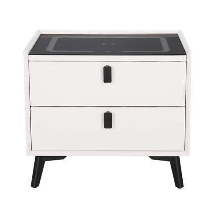Upgrade your living space with the Artiss Aika Smart Bedside Table. The table allows you to charge your phone wirelessly or via USB, and also contains a Bluetooth speaker to listen to your favourite tunes. Constructed from quality MDF upholstered with premium PU leather and topped with a tempered glass tabletop, the smart table is perfectly stylish and durable. The two drawers feature sleek metal handles and ample storage space for all your night-time essentials. With one USB and one type C charging port, you can charge your devices both wirelessly and wired. Adjust the light-up charging panel to achieve the perfect ambience for sleep. The metal legs will keep your table standing, while anti-slip pads keep the piece in place and protect your floors. Easy to assemble and even easier to maintain, you'll love the style and functionality of the Aika Smart Bedside Table from Artiss.
