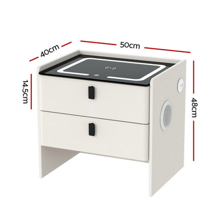 Upgrade your bedroom with the Artiss Smart Bedside Table, offering a perfect combination of technology and sleek design. This table features wireless charging, dual Bluetooth speakers, and both USB and type-C charging ports, all powered by an SAA adaptor. The three adjustable LED light colours allow you to customise your ambience, whether you're reading or relaxing.