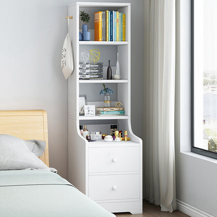 This modern minimalist bookcase bedside table features a pure warm white design, combining storage, display, and decorative functions. The upper section has four open storage shelves for placing books, decorative items, photo frames, and other objects, showcasing personal taste and style. The bottom section features two spacious drawers with matching round knobs, providing ample private storage space. The elegant curved side design adds a soft touch, and the top includes a hook for hanging bags, tapestries, or other items. This slim tall cabinet design doesn't take up much space, making it especially suitable for small bedrooms, serving as the perfect combination of bookshelf, display cabinet, and bedside table, both practical and decorative.