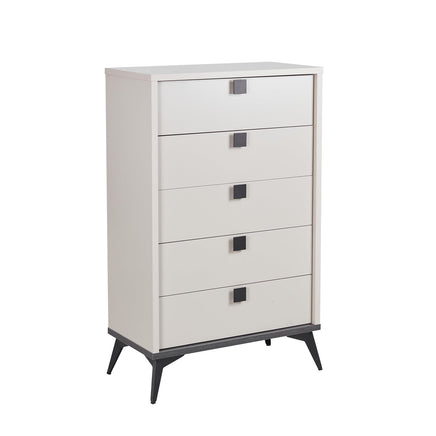 Maxwell tallboy is made of MDF which makes it very much strong and resilient. Again, melamine finishing on it ensures smooth texture. Moreover, the drawer handles and legs are in metal which speaks of the quality of our Maxwell tallboy.