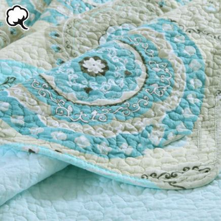 This contemporary 100% Cotton Lightly Quilted Coverlet Set Suzani Queen will help you create your dream bedroom style. It features a soothing quilted mandala circles design in soft colour hues of turquoise, cream, brown, and white. Approx 150gsm filling. Exquisite quilting process of quit set can maintain cotton filler effectively. Light weight, medium warmth, year-round use Easy-Care Machine Washable, Prewashed and preshrunk. It is made from soft touch and easy care 100% Cotton fabric and Pure Cotton filling with softness that offers a relaxing night's sleep.