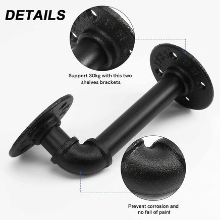Made of high quality iron with water-proof black coated finish, this iron pipe floating shelf brackets can hold up to 30kg, aslo the included high strength screws made this pipe shelving can be mounted to the wall or wood sturdy.