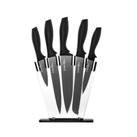 Do you love to cook? Our 7-Piece Kitchen Knife Set will keep your cooking skills sharp. The knife set comes with a chef knife, bread knife, carving knife, utility knife, paring knife, and a wooden knife block to keep your collection organised and protected. Slice, dice, cut and gut, there's a knife for every cooking situation. Each knife is made from quality stainless steel and is constructed from a single piece for extra comfort and protection. Unlike other basic kitchen knife sets, our knives feature a non-scratch, non-stick coating that is easy to clean and incredibly rust-resistant. It has a well-balanced hollow ergonomic handle making it easy to hold and use. Includes a two-stage sharpener to keep your knives sharp and ready to go at all times. The knives have a hardness rating (HRC) of 53�2, making them perfect for student chefs and home cooks on a budget. With its sleek modern design, the knife set is the perfect gift for a budding chef, first homeowner, or even for yourself. Spruce up your kitchen and elevate your cooking skills today with our comprehensive 7-Piece Knife Set.