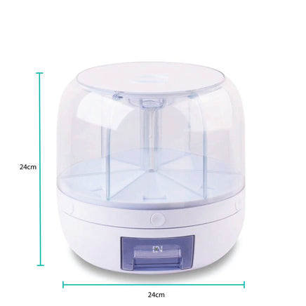 Optimise your kitchen's arrangement and save space with our versatile 3Kg capacity storage compartment, ideal for storing up to six dry food varieties. The 360-degree rotating design provides effortless access to each compartment, with individual buttons for easy dispensing and drawer. This durable container ensures long-lasting utility, while its one-click dispensing feature minimises air exposure.