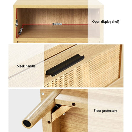 Lending a unique character to any bedroom aesthetic, our Artiss rattan bedside table enables you to achieve a seaside cottage look effortlessly. Its intricate rattan detailing draws the eye to its impeccable craftsmanship. Flaunting crisp, light, and breezy style, our rattan bedside table will complement your boho-inspired bedroom décor. It's crafted from thick a particle board with paper finish, making it sturdy, durable, and attractive, and the solid wood legs are well-proportioned, stable, and durable. Plus, the floor protectors attached to its legs keep your floors safe and scratch-free. Our rattan bedside table has a spacious drawer and an open display shelf with sleek aluminium handles and smooth metal runners. It has ample storage space to keep your vases, stylish houseplants, photo frames, bedside lamps, night-time essentials, and other decorative pieces. Artiss rattan bedside table is more than just a bedroom stunner. Without any further thought, bring home this exceptional piece of furniture today.
