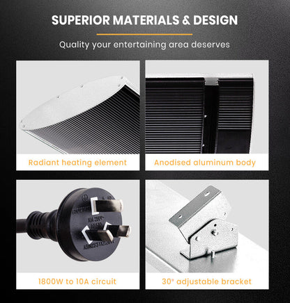 A 1800 watt electric element is embedded in the black anodised aluminium strip that rapidly produces even and gentle heat dispersion. Plus, unlike gas heaters there is no glow or glare, and no need to refuel - providing huge running costs savings.