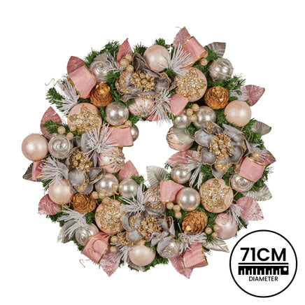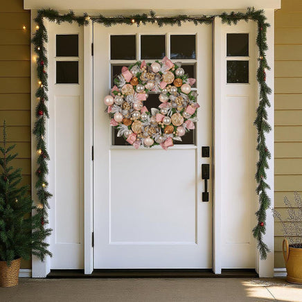 Deck your doorway in decadence. This lush green wreath sparkles with jewelled baubles, florals, pine cones and ribbon in elegant pink, champagne and silver. Fully pre-decorated and perfectly sized for walls, doors or mantels, it is a ready-made Christmas statement that brings festive charm without lifting a decorating finger.