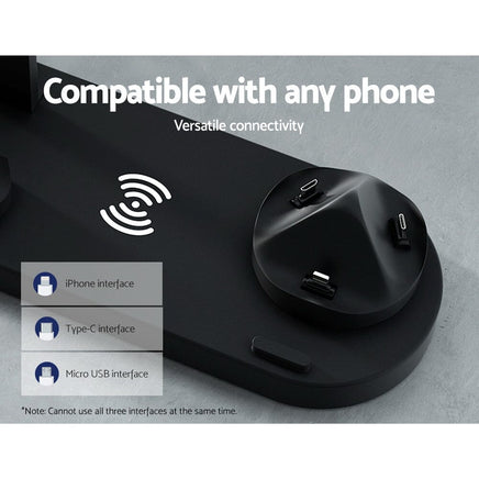 Charge everything in the same place and all at once with the convenient 4-in-1 Wireless Charger from Devanti. It supports 10W max charging for four devices at once: up to two smartphones, iWatches, Airpods. Forget having to plug in several chargers ýÿ you can use a single charging station to simplify your life and clean up your desktop. It includes three interface types for most smartphone models, as well as 10W Qi-certified wireless charging. The device features temperature protection, overcharge protection, over-voltage protection and short-circuit protection for a completely safe charging experience. It has a non-slip baffle, magnetic watch charger, 360-degree swivel and a vertical holder design so you can use your phone while charging. Keep your desktop clear and your devices charged with the Devanti 4-in-1 Wireless Charger.