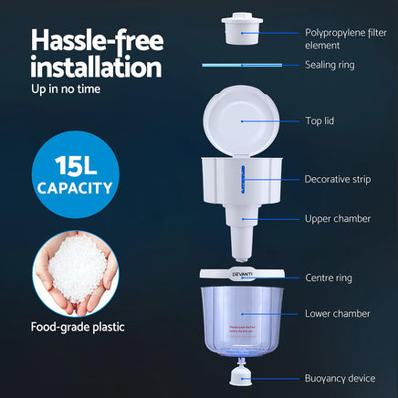 Introducing the Devanti Water Cooler, a top-loading unit featuring a 15-liter refillable purifier container. Equipped with electronic cooling technology, it offers both hot and cold waterspouts, tap water filtering, and robust safety measures including over-current, electric shock, dry-run, and overheat protection.