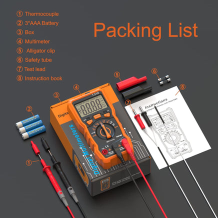 PACKING LIST:1x Electrical Multimeter , 1x probe test leads, 2x alligator clips, 1x Thermocouple, 2x Safety tubes, 3xAAA batteries, 1X User manual