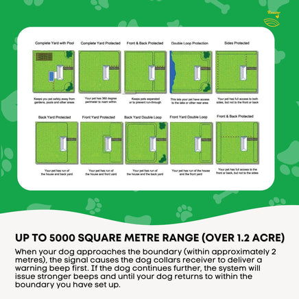 This hidden TP16 fencing system is a cost-efficient pet friendly containment systems. A buried wire transmits a harmless radio signal. When your dog approaches the boundary (within approximately 2 metres), the signal causes the dog collars receiver to deliver a warning beep first. If the dog continues further, the system will issue stronger beeps and until your dog returns to within the boundary you have set up.