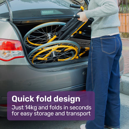Equipped with an adjustable seatbelt for secure positioning, this wheelchair also features dual-wheel brakes for added stability. The 22-inch airless rear tyres provide a smooth, steady ride, while the 360-degree swivelling front castors allow easy navigation through tight spaces, ensuring effortless control in any environment.