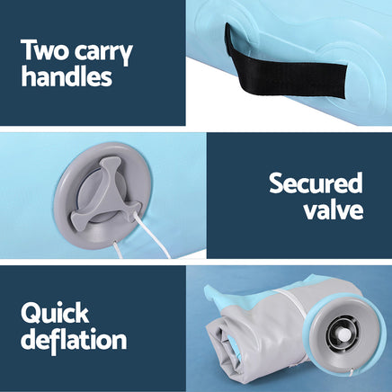 For hours of jumping, fighting and tumbling fun, the Everfit Air Track with pump is a great addition to your home gym. Perfect for gymnastics, martial arts, yoga, cheerleading and more, the 1m air track is a versatile and essential tool for your training regime. Crafted with drop-stitched 1000-denier double-wall fabric, the Everfit air track ensures durability and stability during intense workouts. Softer than foam and designed for robust use, the air track won't twist or bend and helps to significantly reduce impact. Its anti-slip and wear-resistant surface provides a secure grip, allowing you to perform your moves with confidence. The integrated valve system allows for quick and easy inflation and deflation, while the compact roll-up design makes storage and transport a breeze. With two convenient carrying handles and a repair kit included, the Everfit 1m Air Track is the perfect choice for athletes seeking a reliable and portable training solution.