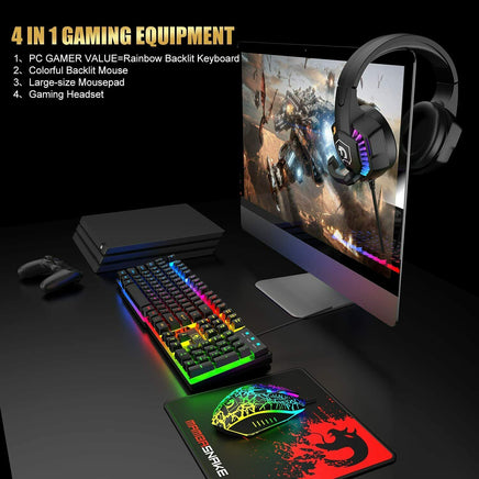 4in1 Wired Gaming Keyboard Mouse with Mechanical Feel RGB Backlight Full Anti-ghosting Keys 3D Stereo Gaming Headset Adjustable Mic 2400DPI Mice Large Mousepad or PC Mac Gamer Office Typist