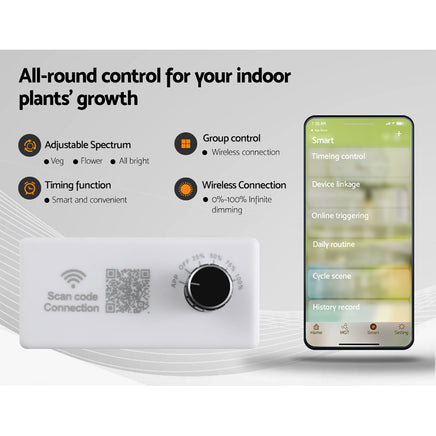 Just like us, our indoor plants can suffer if not exposed to the nourishing light of the sun. No windows? No problem - not with the Greenfingers Quantum Board LED Grow Light with Smart App Control. Our grow lights are designed to stimulate plant growth across the full lifecycle by providing a light like the sun, ideal for photosynthesis, with varying levels of lumen output (intensity) and the full spectrum of light. Using quality Samsung LM281B diodes and a Sosen driver, it is a full-spectrum lighting device. The grow light has adjustable settings for Vegetables, Flowers and All Bright conditions(except for 1000W). There are timing settings for each setting, and using the smart app allows for full remote control over each light and 0-100 infinite dimming(except for 1000W1500W). It uses a thick aluminium heat sink to ensure proper heat dispersion, and is more energy saving than old High Pressure Sodium (HPS) lights. Show off your Greenfingers with our Greenfingers Quantum Board LED Grow Light with Smart App Control and watch your garden grow today.