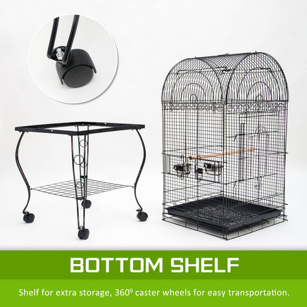 The cage's frame is made of durable and high-quality wrought iron and it is powder coated in order to prevent it from rusting and offer a longer service life. There is one lockable door on the front and one on the top of the cage so you can keep your bird safe and have easy access inside the cage. There is also a removable tray under in order to make cleaning easy. There are four, 360 degree swivel caster plastic wheels so relocating the birdcage is very easy. 2 water/food container and 2 rest wooden perches are included. The cage also has a clever shelf under it so you can store your birds' needs, such as water, food and cleaning tools. Another good feature is that the bird dome on top is removable from the stand so you can place it on top of tables or other places.